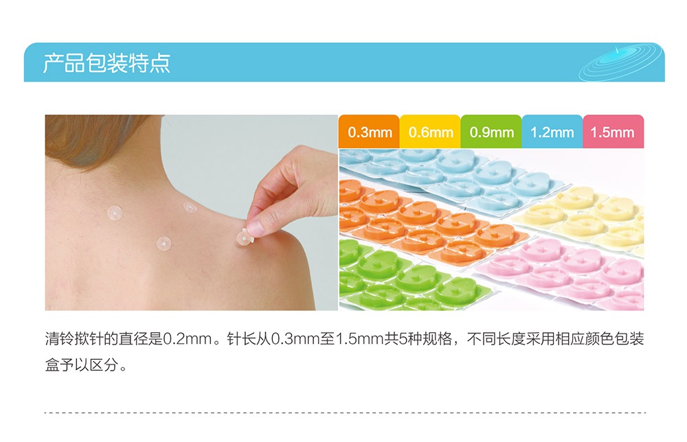 撳針是一種創(chuàng)新型皮內(nèi)針,具有安全,方便,舒適,無創(chuàng)痛等特點。2002年開始研發(fā),2004年正式在日本上市。撳針直徑均為0.2mm。針長從0.3mm至1.5mm共五種規(guī)格。按照日本QMS(醫(yī)療器械生產(chǎn)質(zhì)量管理體系)生產(chǎn)。獲得美國FDA認(rèn)證,歐洲CE認(rèn)證,SFDA認(rèn)證及ISO13485質(zhì)量體系認(rèn)證。